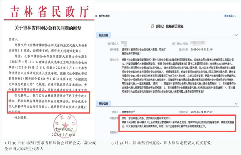 2023年4月,田大原在未卸任长春市律师协会会长的情况下,便被吉林省司法厅主管律师协会的副厅长林松推荐为省律师协会会长候选人,并“顺利”当选。副厅长林松在田大原未能提供由民政局委托的会计师事务所出具的离任审计报告的情况下,依然违法批准通过了其法定代表人身份的变更审核。这一明显的违规状态竟然持续了长达两年多的时间,直至 2025年7月10日,吉林省民政厅出具的《关于吉林省律师协会有关问题的答复》,明确指出:田大原同时担任省、市律师协会法定代表人,违反《社会团体登记管理条例》; 在此基础上,民政厅已向吉林省律师协会下达了《责令改正通知书》,要求吉林省律师协会组织召开理事会议,辞去或免去田大原省律师协会法定代表人,选举新的法定代表人并履行相关手续。