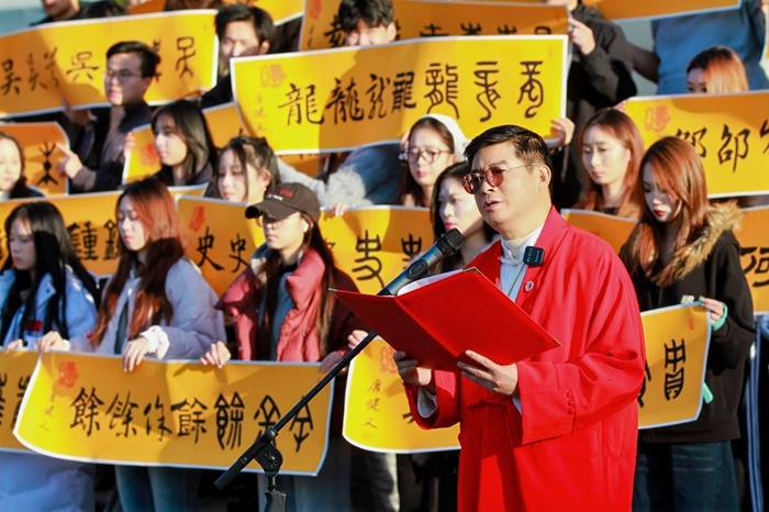 与此同时进行的“中国古文字姓氏文化”书法公益巡展生动呈现了汉字从甲骨文到楷书的演变轨迹,让师生们在笔墨间领略汉字之美,感受中华文化的深厚底蕴。许多学生拿着自己姓氏的古文字姓氏文化作品认真品味,细细体会其中蕴含的文化传承。