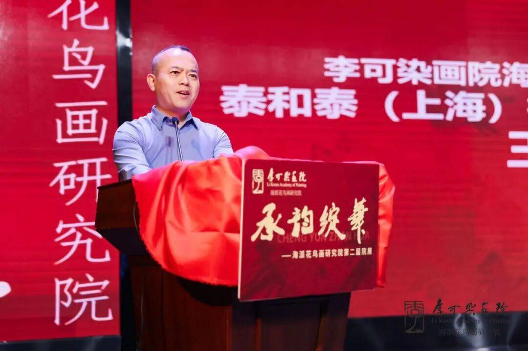 在接下来的揭牌仪式中,李可染画院海派花鸟画研究院执行院长颜寅作为嘉宾为海派花鸟画研究院潮汕创研基地熊绍斌,海派花鸟画研究院景德镇创研基地孙科磊,海派花鸟画研究院厦门创研基地高雅瑜、陈青莉,海派花鸟画研究院宜兴创研基地曹亚萍,海派花鸟画研究院美龄创研基地余红霞进行揭牌。最后李可染画院海派花鸟画研究院执行院长颜寅进行发言。
