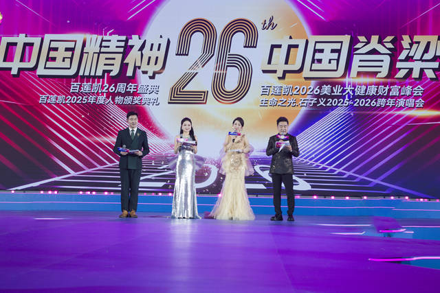 1月25日,东莞洲际酒店的宴会大厅,灯火璀璨、宾朋云集,民族美业连锁领军品牌百莲凯在此盛大启幕26周年盛典。以“中国精神·中国脊梁”为核心主题,这场融合了“生命之光·石子义2025-2026跨年演唱会”与“百莲凯2025年度人物颁奖典礼”的行业盛会,用多元创新的呈现形式,为现场嘉宾与全国美业人献上了一场兼具文化厚度与视觉张力的年度盛宴。