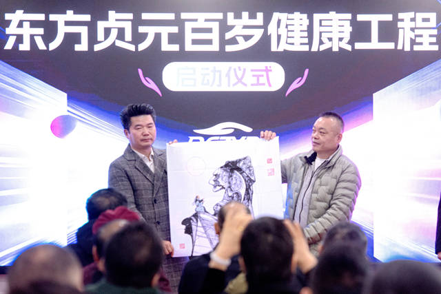 一段彰显文化底蕴的环节将现场气氛推向高潮。中国艺术经济研究院研究员黄中登台捐赠地质科学家、作家、画家昆仑山人创作的昆仑石画作,解读国宝《国卷江山图》的健康寓意,以山河绵延长青的文化象征,隐喻健康事业的永续发展。随后,郭军董事长代表东方贞元接受这份寓意深远的赠礼,实现了传统文化传承与健康事业发展的美好交融。