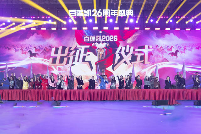 随后举行的百莲凯2026年度出征仪式庄严而盛大。百莲凯高管与核心加盟商代表共同宣誓,铿锵有力的誓言回荡在整个会场,象征着百莲凯在新一年里勇毅前行、再创辉煌的坚定决心。而激动人心的切生日蛋糕环节,更是将现场氛围推向极致。百莲凯高管、特约嘉宾代表及加盟商代表共同上台,在全场观众的倒计时声中切开象征品牌26周岁的生日蛋糕,甜蜜的蛋糕承载着美好的祝福,也寓意着百莲凯未来的发展将更加圆满顺遂。